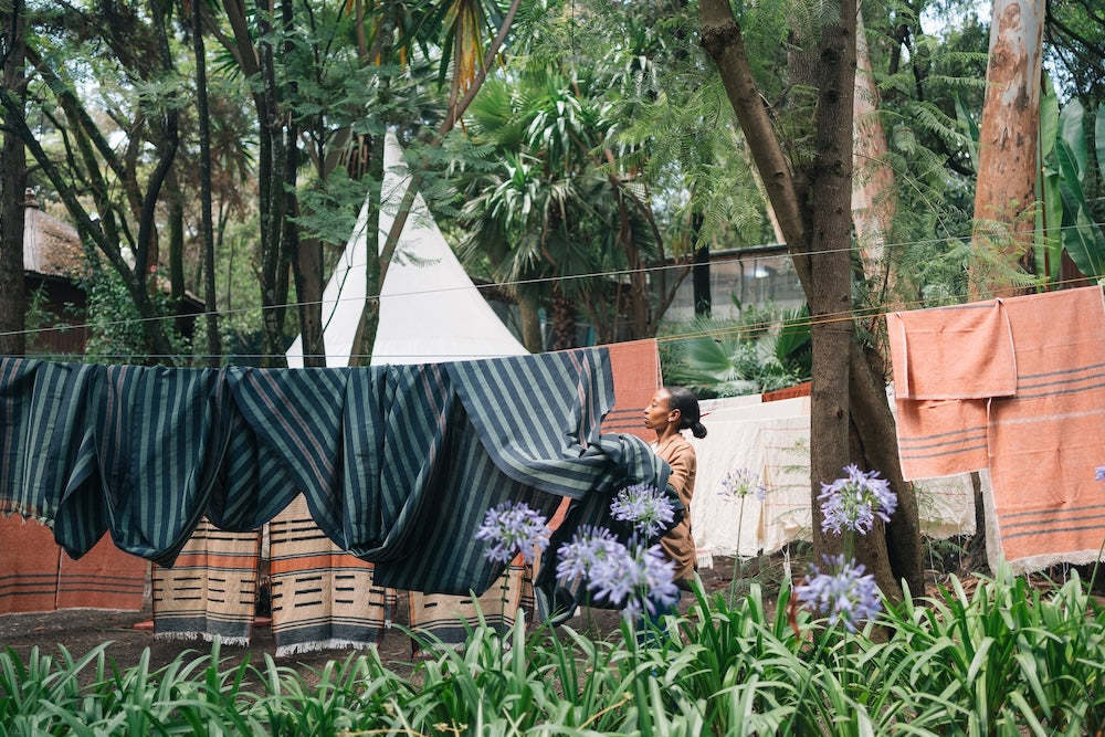 For this piece, the traditional has been reimagined through the lens of modern craftsmanship. The scarf was handwoven in Ethiopia and embroidered in Brooklyn in collaboration with textile artist Krystle Collins, whose work celebrates African American cultural expression. Her embroidery brings a fresh narrative to the cloth, echoing the legacy of the original while making space for new stories to unfold.